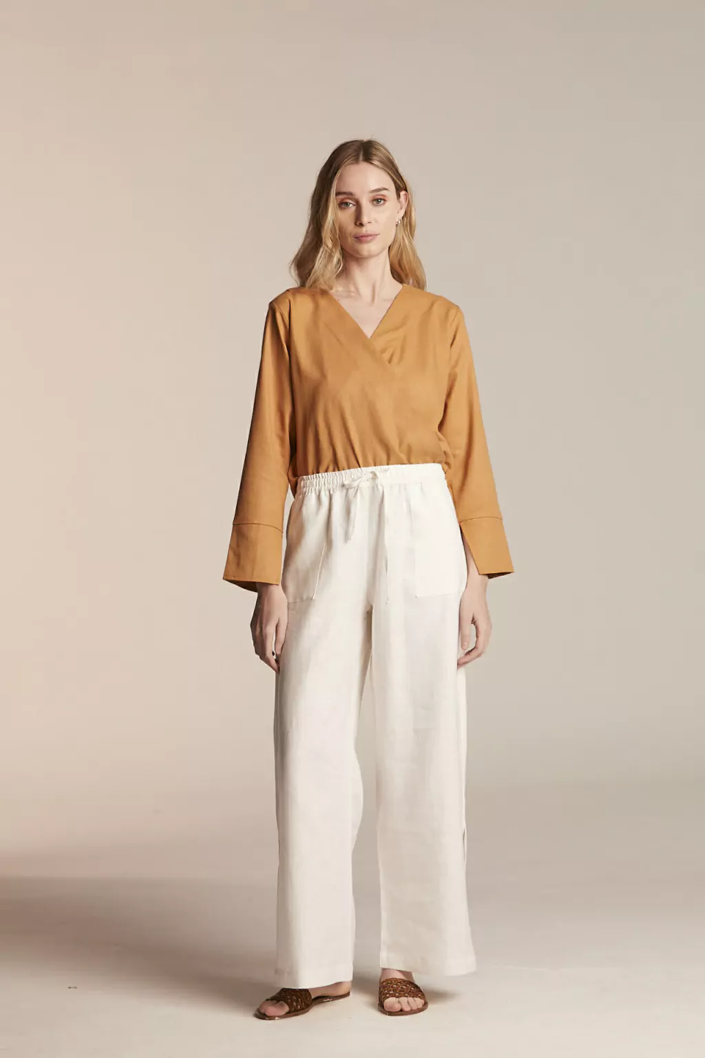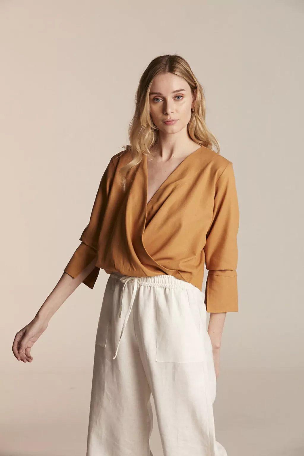 Esta blusa es un mil! Manga larga de lino blend con escote cruzado, largo a la cintura y puños anchos con tajo. Es súper versátil a la hora de combinarla con prendas inferiores! Viene en Negro, Camel, Off white y Beige