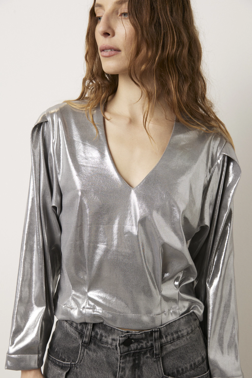Blusa manga larga de jersey lame, con escote V profundo y tablas en mangas. Hace conjunto con el pantalón arequito. Ideal para un look de noche.