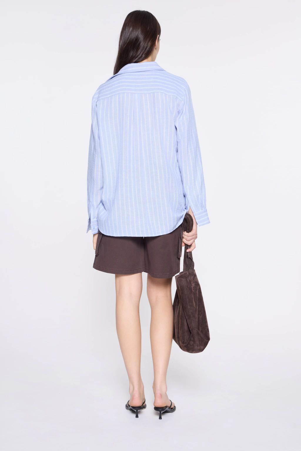 Camisa a rayas de mangas largas, con calce regular y hombro levemente caído.