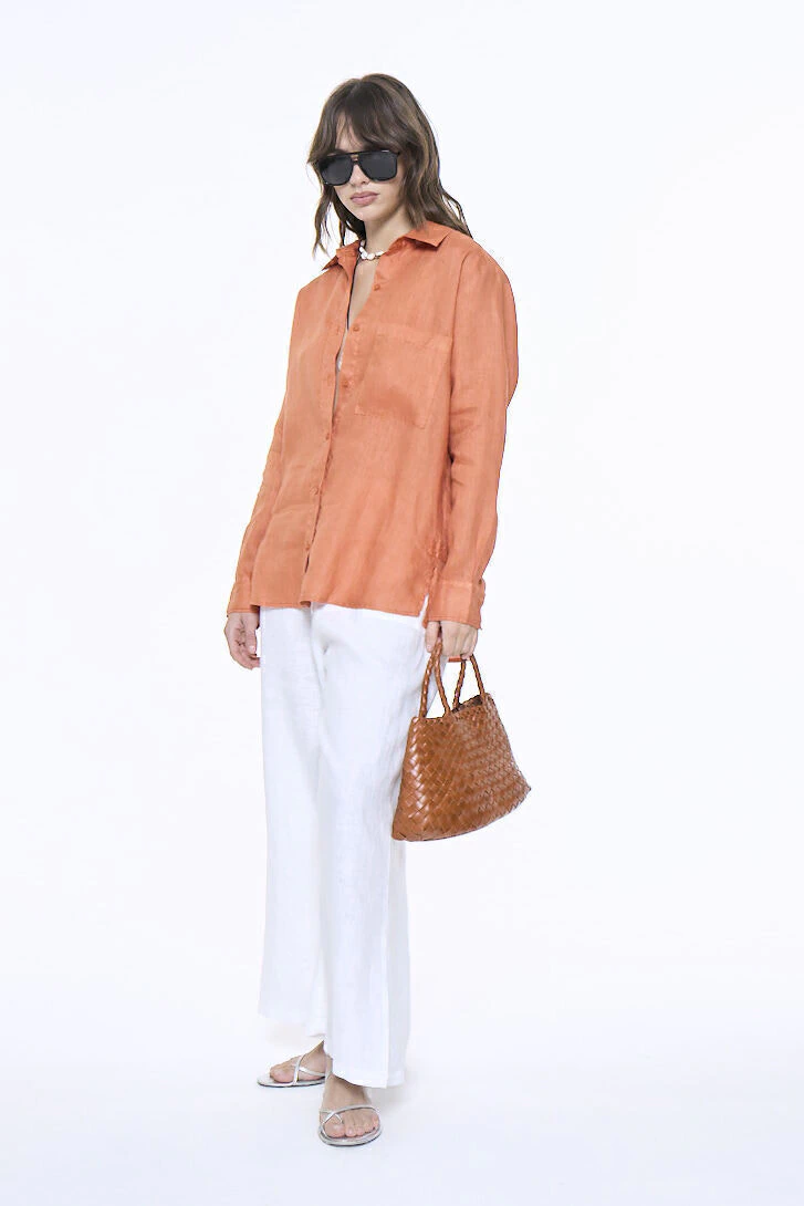 Camisa de 100% lino, de mangas largas, con calce regular y hombro levemente caído.