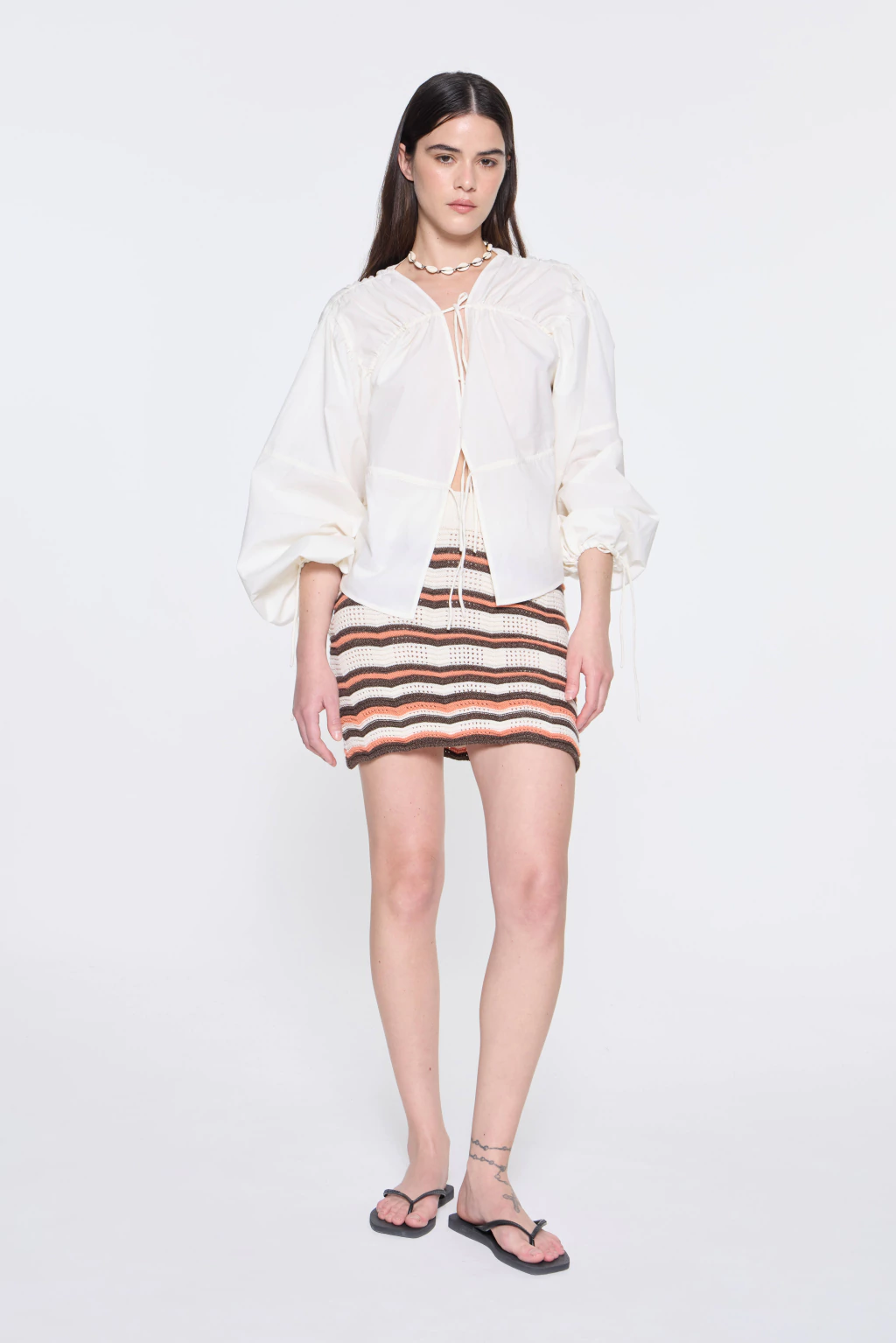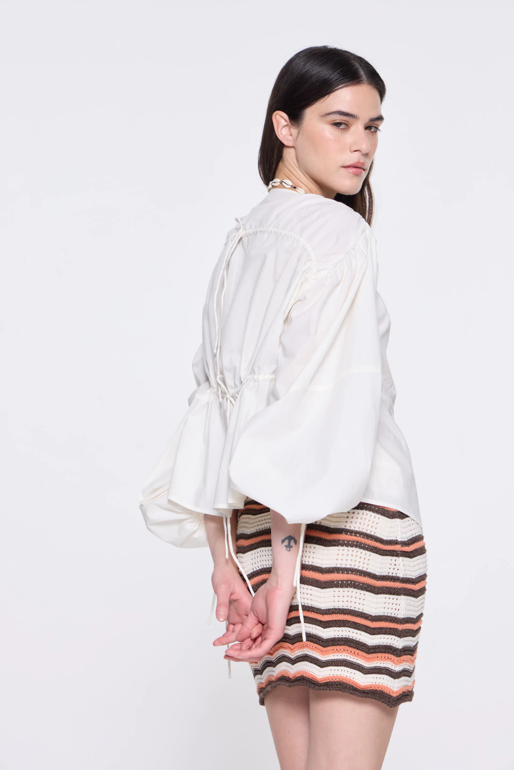 Camisa confeccionada en poplín de algodón, de largo modular por sobre la cadera. Posee ajuste en mitad del pecho y en la cintura con fuelle por donde pasan cordones que permiten fruncir la prenda. cuenta con mangas largas con cordones para ajustar los puños, generando una silueta volumétrica y distintiva.