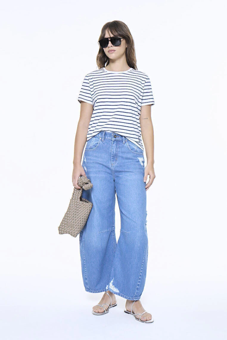 Jean de tiro medio con silueta baggy, confeccionado en denim 100% algodón con trama blanca. presenta pinzas en el interior de la pierna y recorte lateral desplazado hacia adelante. Lavado localizado con bigotes, ruedo desflecado y roturas en la parte superior delantera.