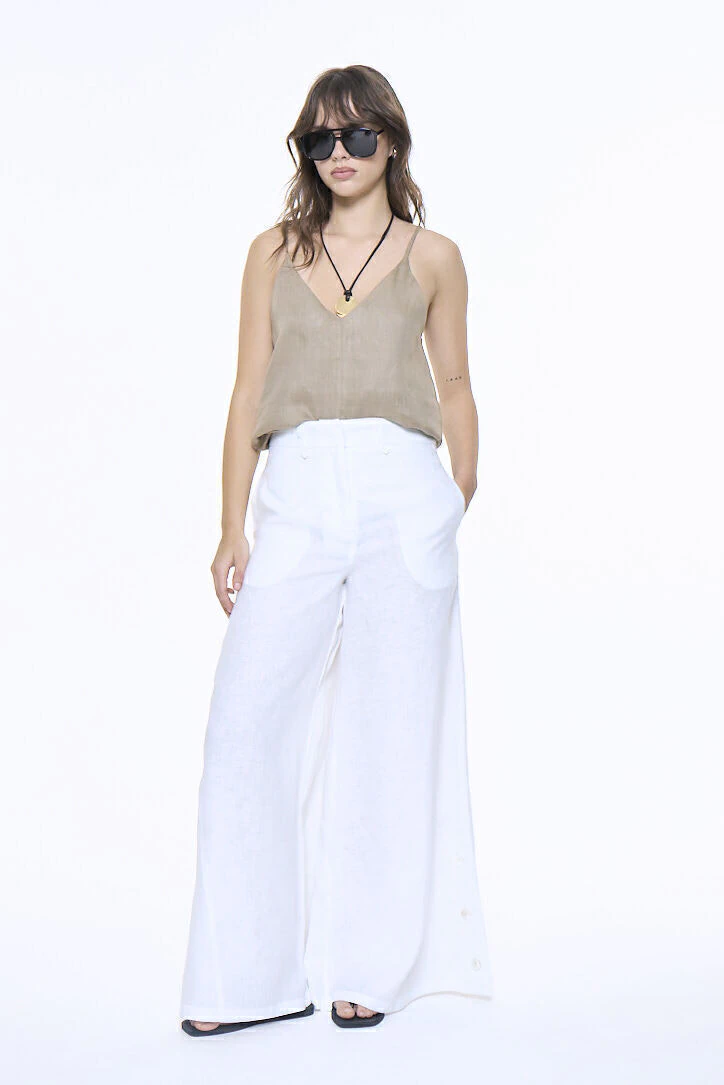 Pantalón confeccionado en lino sastrero 100% lino. De tiro medio y silueta wide leg, se destaca por los recortes diagonales en las piernas y la apertura lateral con botones, que aportan un detalle diferencial.