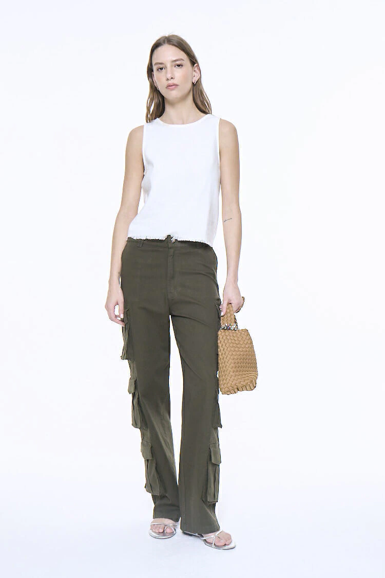 Cuenta con bolsillos laterales y traseros, además de bolsillos cargo con fuelle en ambos lados que aportan funcionalidad y un estilo utilitario.