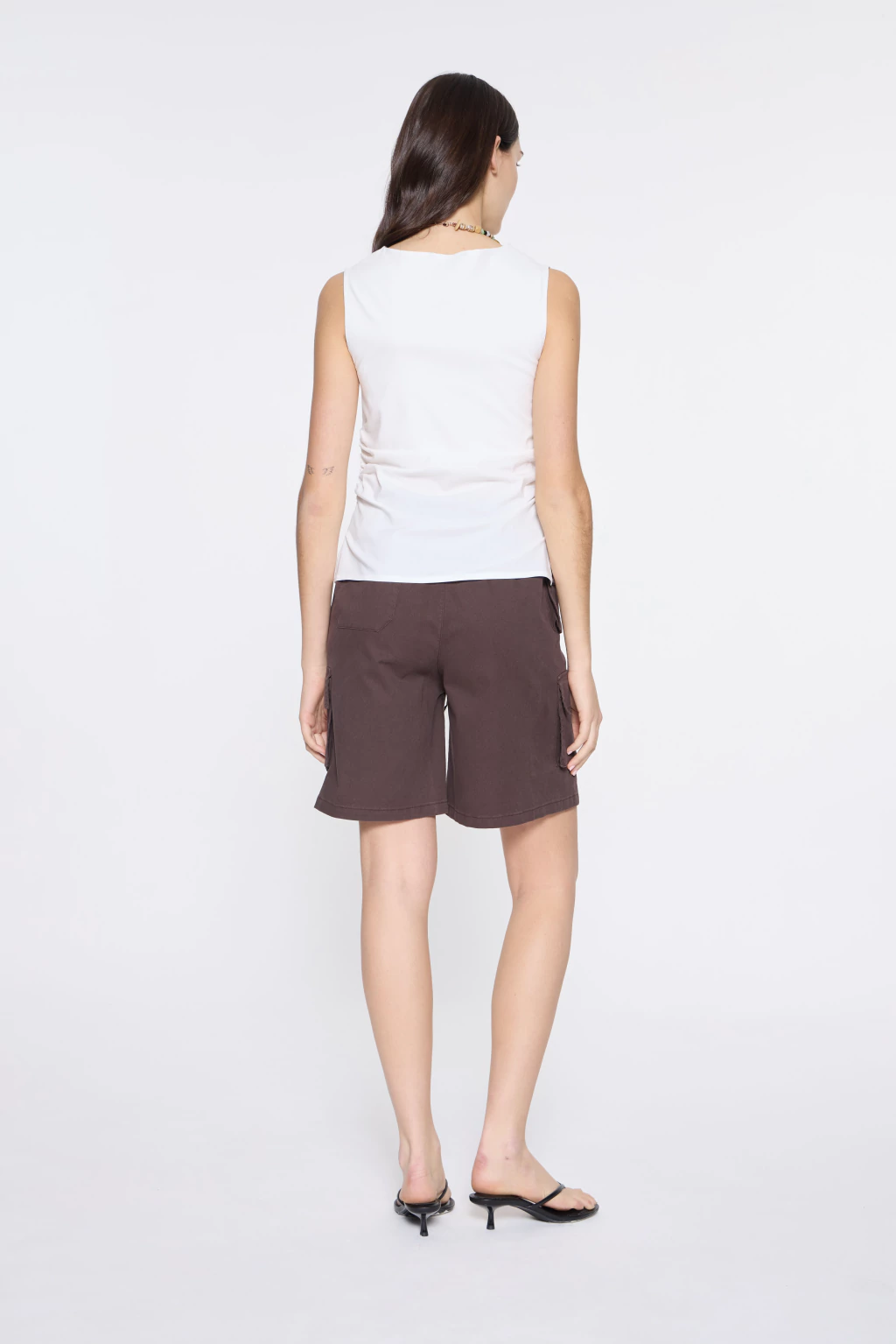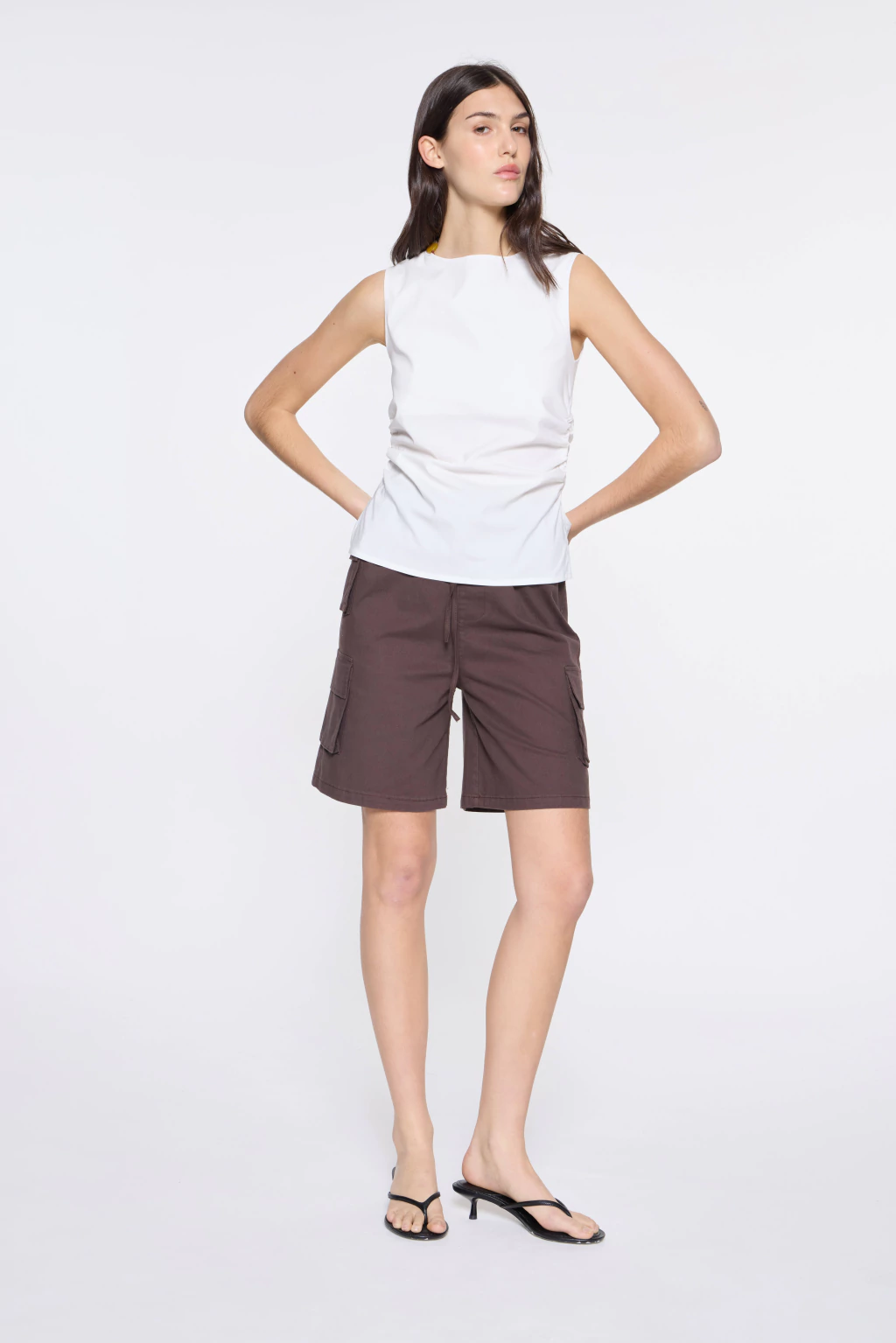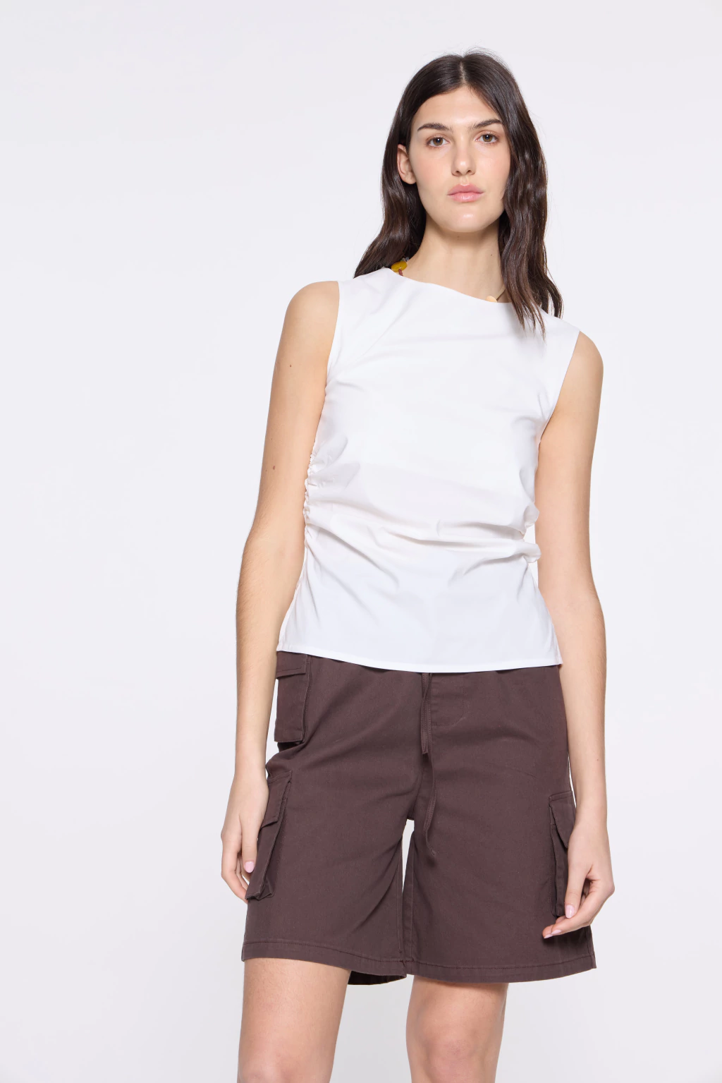 Top ajustado al cuerpo, sin mangas, confeccionado con elásticos en los laterales que generan aberturas sutilmente enfatizando la silueta.