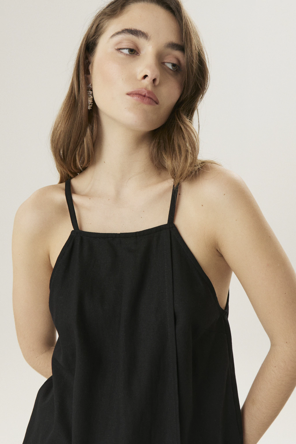 Top lino blend, con escote halter. Sobredelantero tableado. Detalle de abertura en espalda con botón.