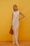 Vestido lencero confeccionado en natural crepe de viscosa en combinación con encaje en escote delantero y de espalda. De largo midi y calce regular.